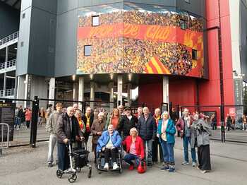 Een warme ontvangst met een groepsfoto voor het stadion.